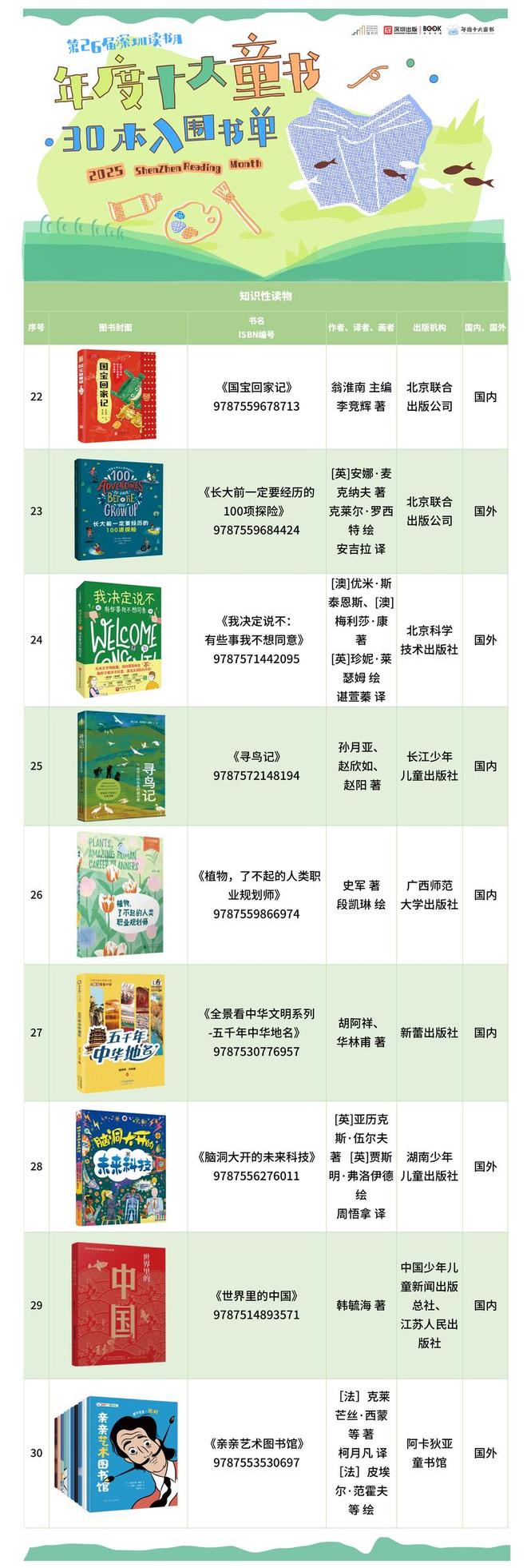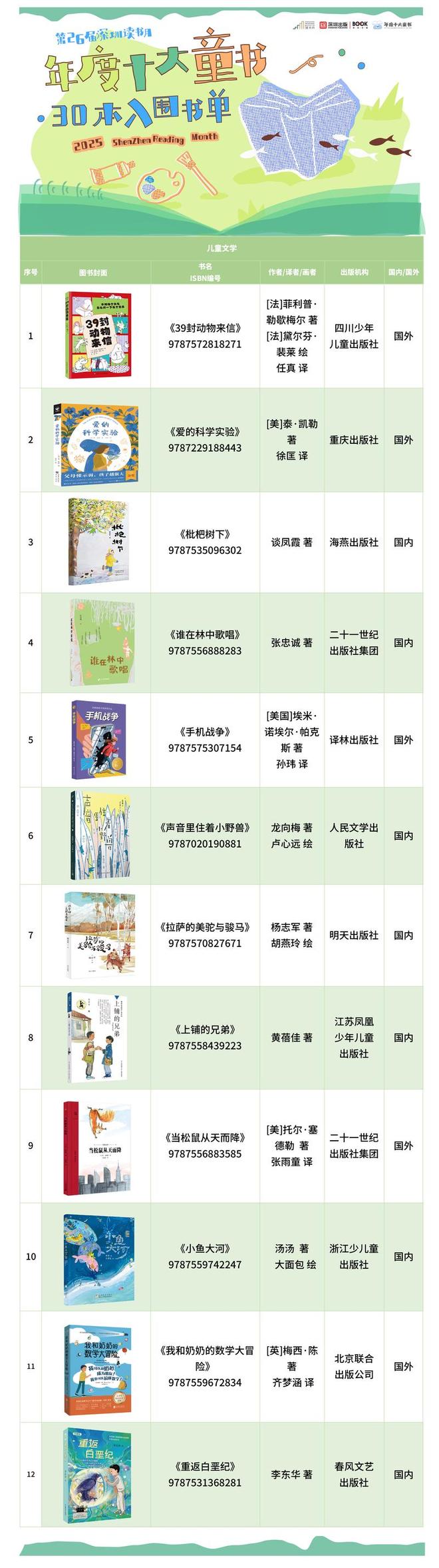 深晚记者获悉,第二十六届深圳读书月“年度十大童书”30强入围书单已正式发布。作为童书领域最具参考性、最有影响力的榜单之一,“年度十大童书”评选活动由深圳市委宣传部、深圳读书月组委会、深圳市教育局主办,福田区委宣传部支持,深圳出版集团有限公司承办,深圳书城文化(集团)有限公司中心书城分公司具体执行,合作单位为深圳晚报、北京开卷信息技术有限公司。