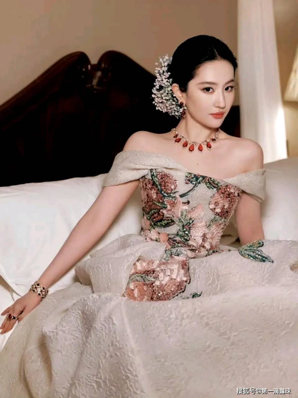 但就是这样的满天星簪花造型,却与“菲皇”的颜值气质相得益彰,大美女的美貌加上簪花头饰造型,竟让网友齐齐忽视了刘亦菲脖子上戴的价值1.2亿元的硕大宝格丽红宝石项链。